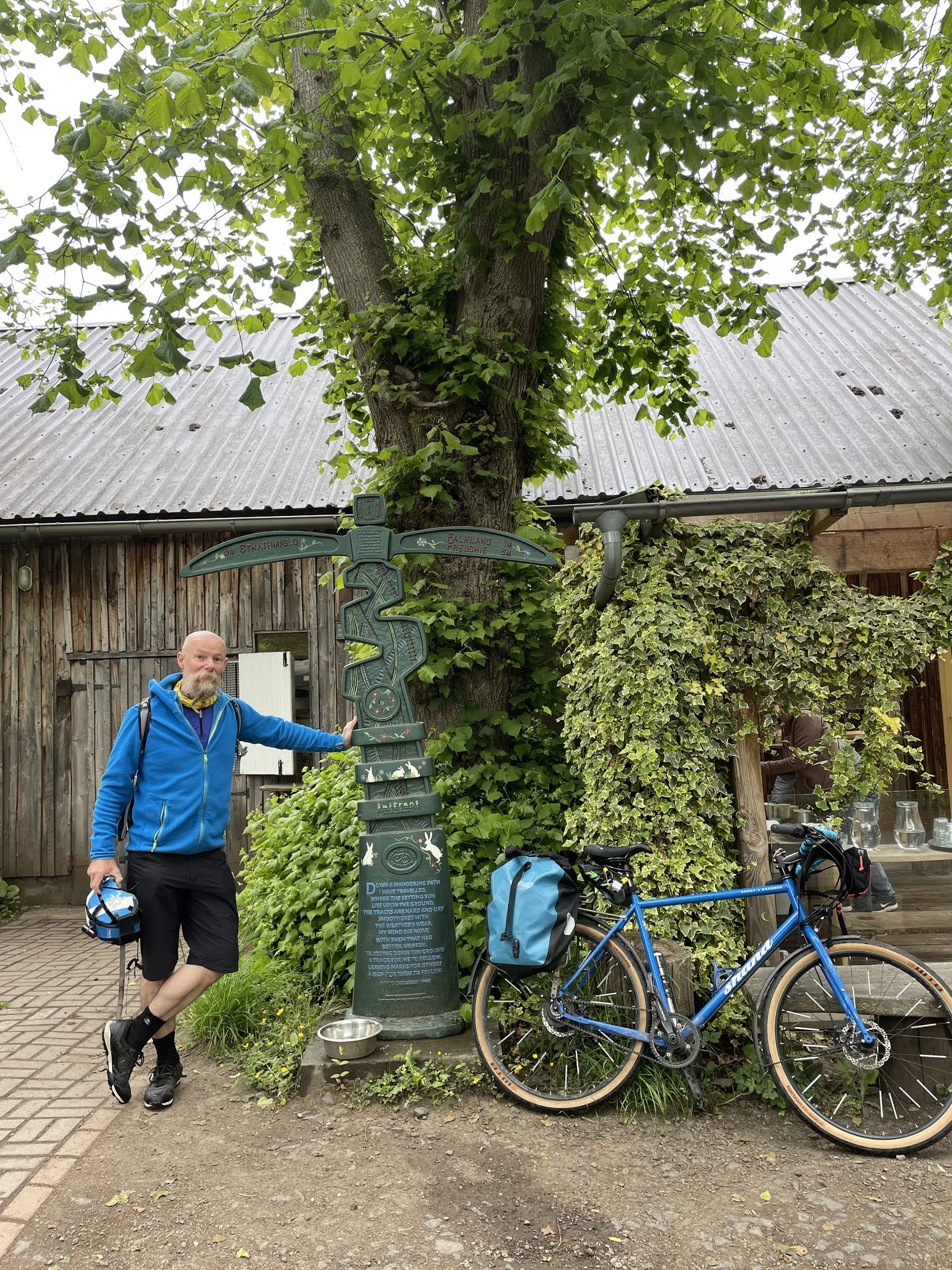 It was a pleasant cycle past a cricket ground where there was a game on, I had been surprised how popular cricket seems to be in fife, then through a forest track to come out near the main road at the pillars of Hercules organic farm and camp site, I loved it this was my first visit here they are very welcoming to cyclists here, even having a separate camping area for cyclists! and there is a millennium post at the café,